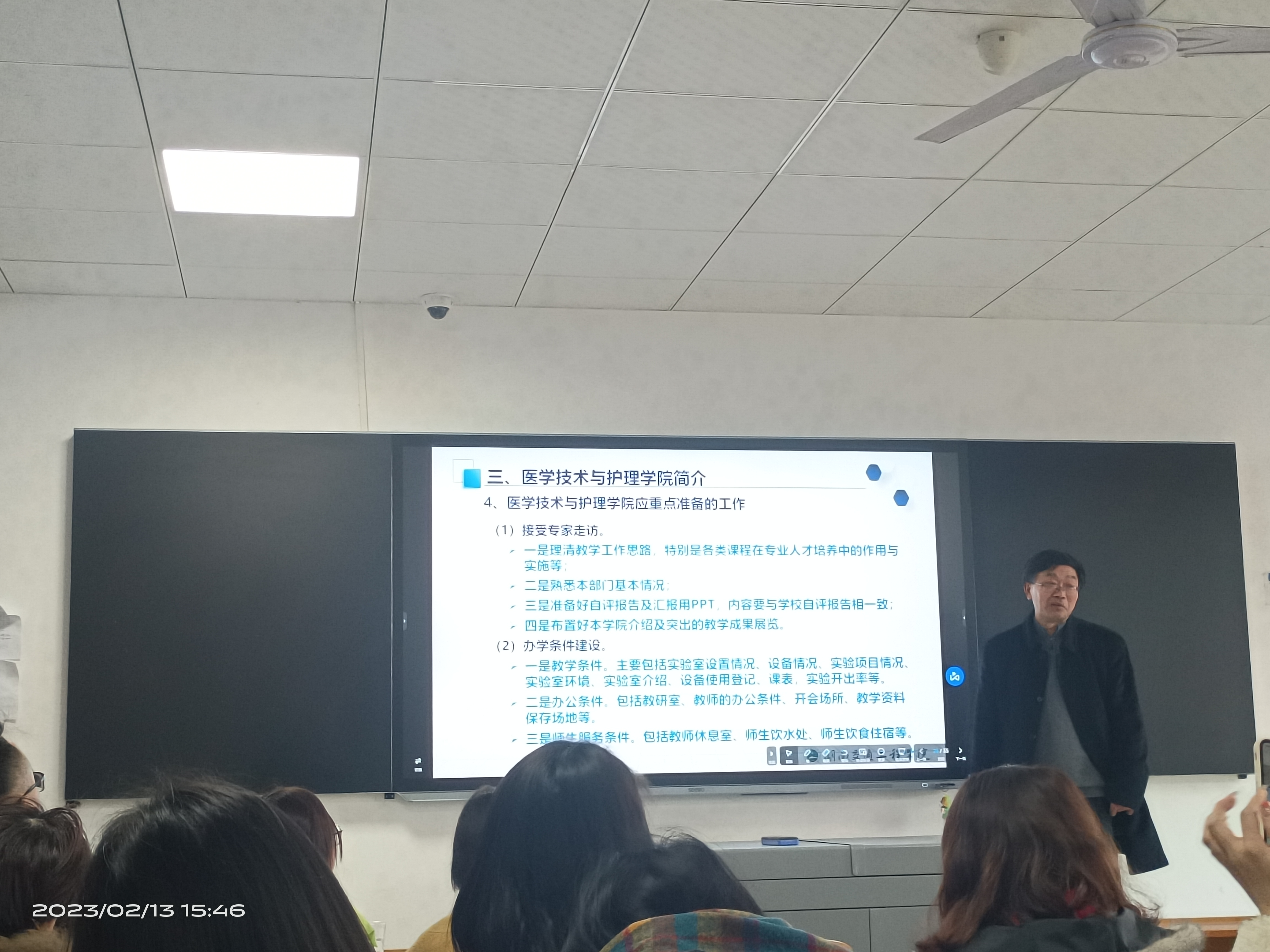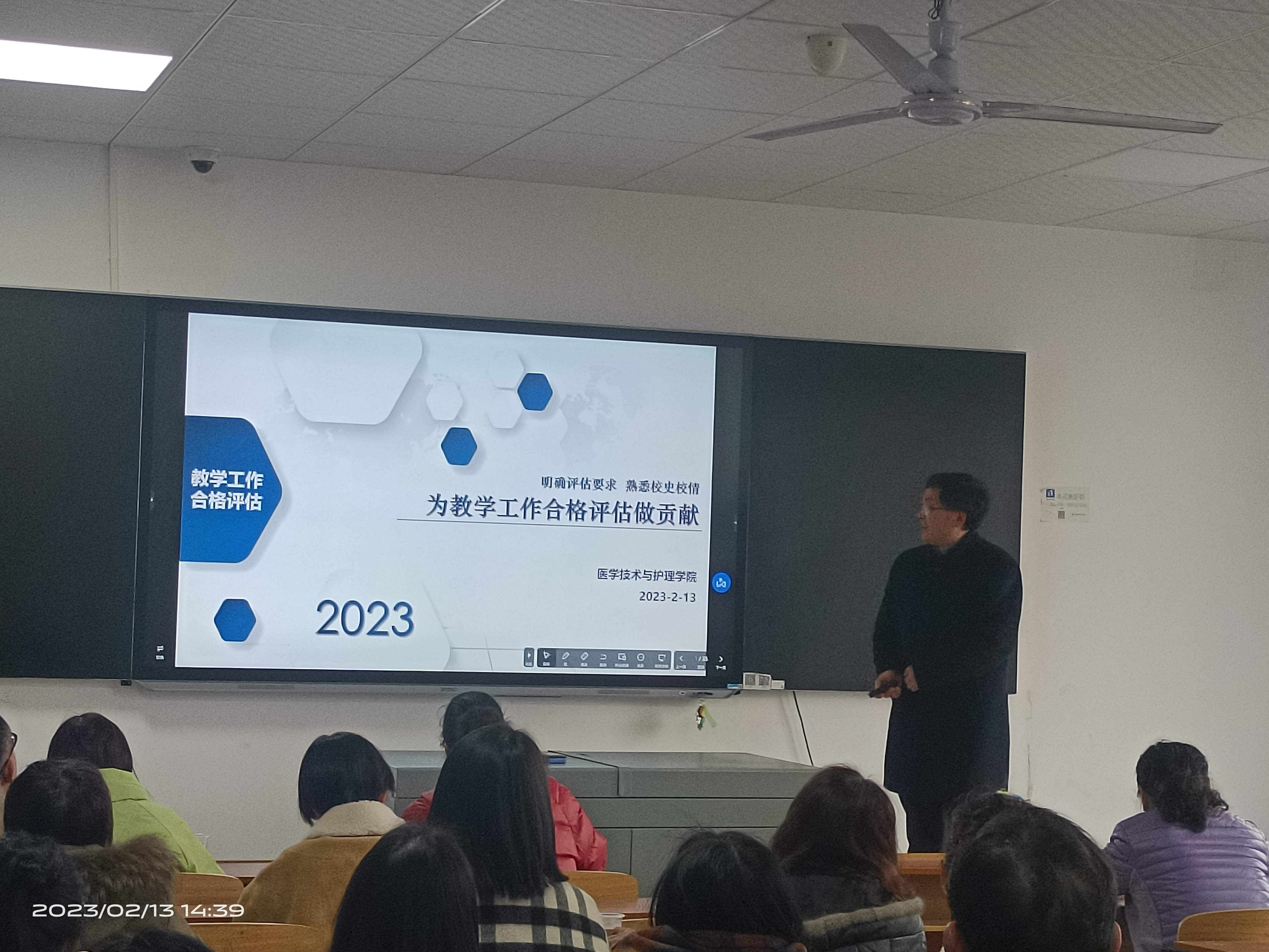 陈熙院长结合二十大精神,合格评估的核心内涵“四个促进、三个基本、两个突出、一个提高”。从“教学工作合格评估的主要特点,我校发展历史与基本情况,医学技术与护理学院简介,教师在合格评估中的使命”等四个部分进行了深入浅出的阐述。围绕合格评估的范围、合格评估的理念、合格评估的核心内涵、合格评估指标的主要特点、专家考察的程序、教学工作中心地位的判断等7个方面进行了讲解;介绍了学校发展沿革、办学思路、办学定位、教学科研机构及本科专业设置、师资队伍、教学条件和办学特色等7个方面;医学技术与护理学院的发展历程、师资状况、突出业绩,以及在评估工作中的准备和要求。强调了教师在合格评估工作中的基本要求、专家听课主要关注的问题、质量监控人员座谈会专家主要关注的问题等方面的内容。