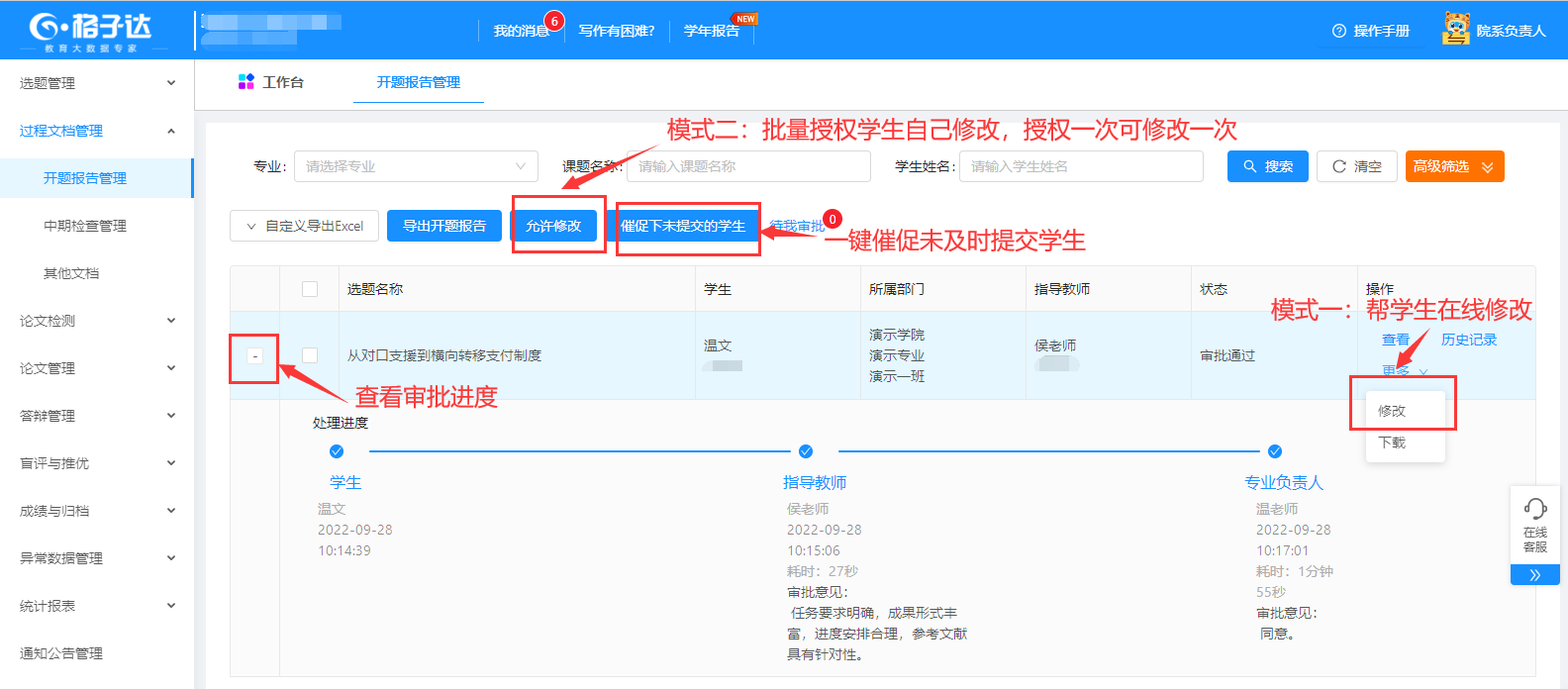 师生双选课题:展示学院所有已经确定师生关系并通过审核的课题,授权修改课题。