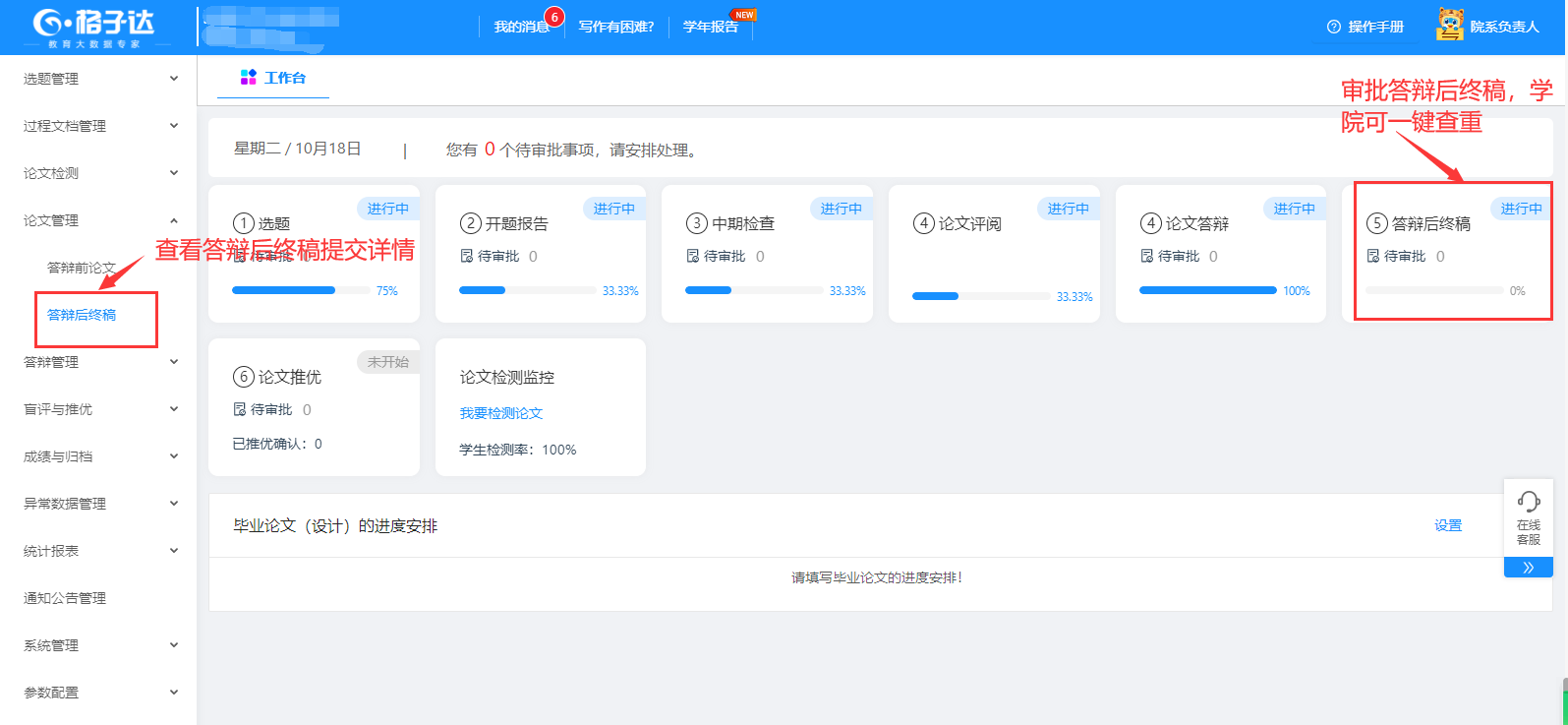 在【工作台】界面,可查看所有过程文档审批情况点击环节可打开毕设论文环节概况报表。