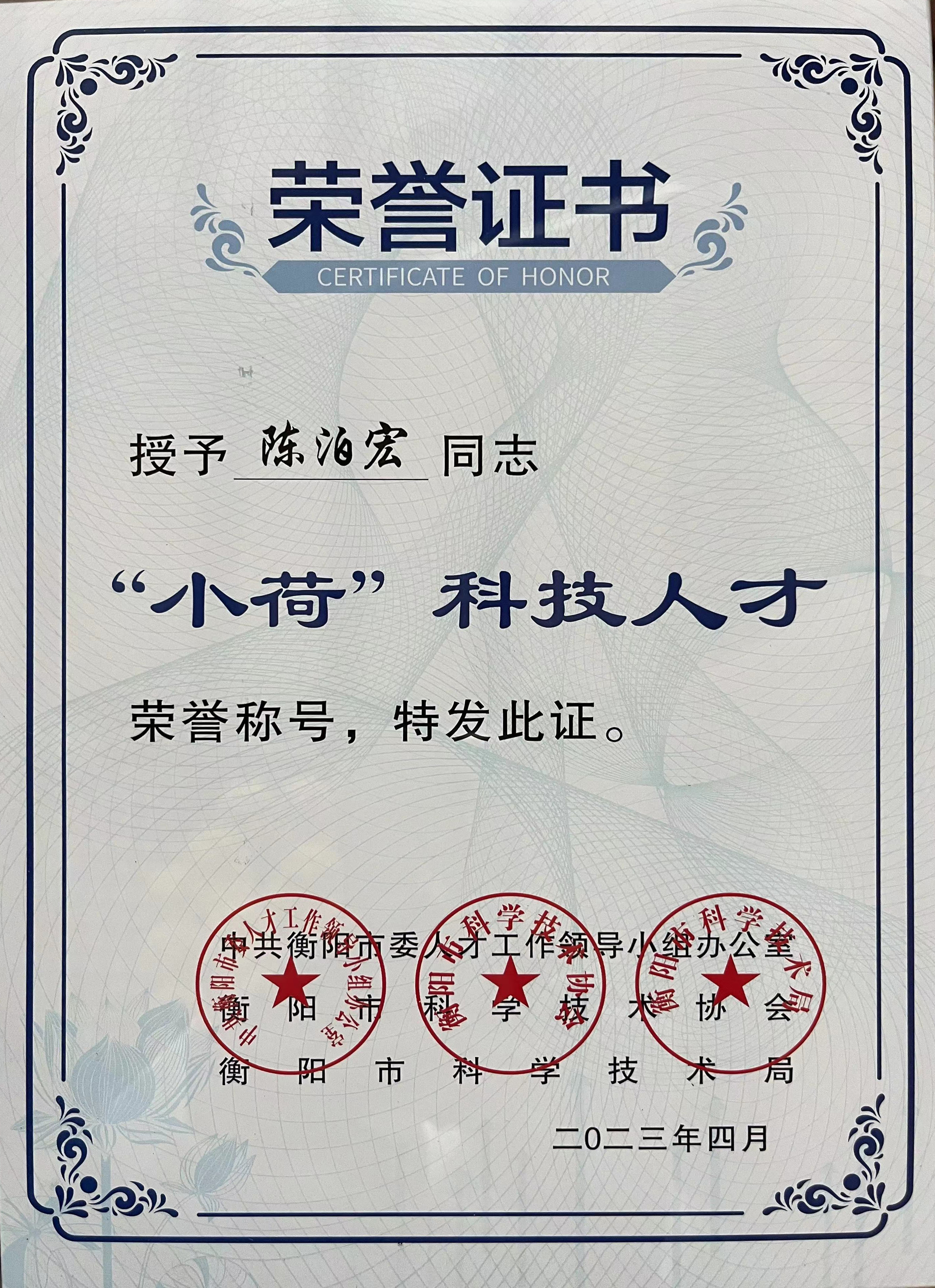 本网讯(记者 赵红深)4月28日,衡阳市科协召开第十一次代表大会, 省科协党组书记、常务副主席王瑰曙,市委书记刘越高出席开幕式并分别讲话,市委副书记、市长朱健主持开幕式。大会表彰了衡阳市首届22名优秀科技工作者和24名“小荷”科技人才,我校机电工程学院青年教师陈泊宏喜获衡阳市首届“小荷”科技人才表彰。这是我校首位获此殊荣的教师,并被衡阳市推荐参加湖南省科技人才托举计划。