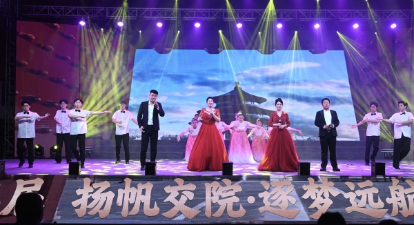 马甦、陈星如、冯天明、周赞、欧莉老师指导的歌舞《为祖国干杯》, 同学们载歌载舞,共庆未来,跳出了爱国情,跳出了中华民族的精气神,也跳出了交工学生的志气、骨气和底气。