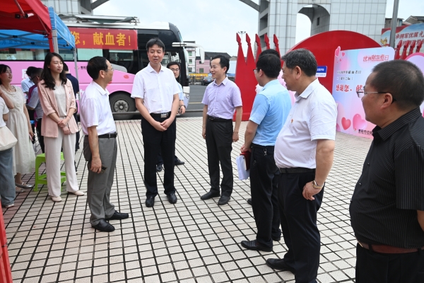 本网讯( 通讯员 摄影 赵红深)6月13日上午,在第二十个“6.14”世界献血者日来临之际,衡阳市副市长谢宏,市卫生健康委党组副书记、副主任邹建军,市红十字会专职副会长周晴和市中心血站党委书记唐先绪等一行6人来我校慰问无偿献血大学生和大学生志愿者,并看望坚守一线的采血工作人员,向他们送上节日的祝贺。学校党委书记刘文君、执行校长刘杰、常务副校长彭文武陪同慰问。