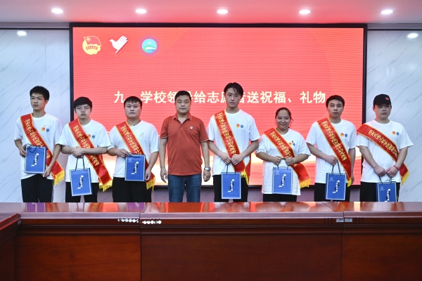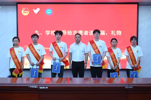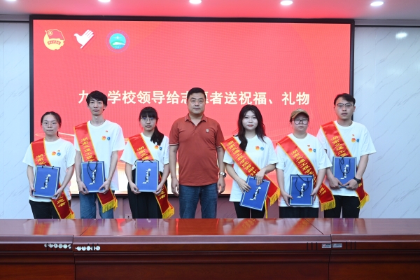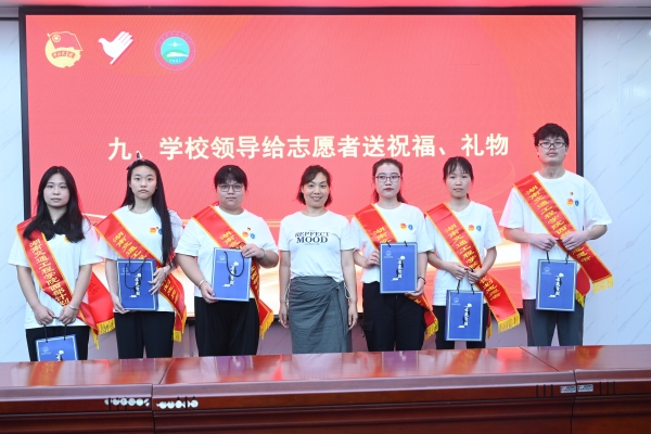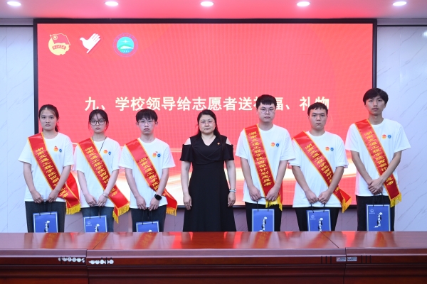 最后,余孟辉、漆在林以及医学技朮与护理学院党总支副书记刘建军、交通运输工程学院党总支副书记肖桂香、电气与信息学院党总支副书记李燕丽、机电工程学院党总支副书记辛敬凤、经济管理学院党总支副书记张敬会分别为谭福玲、杨佩颖等66位志愿者一一佩戴绶带,赠送学校纪念品并合影留念。