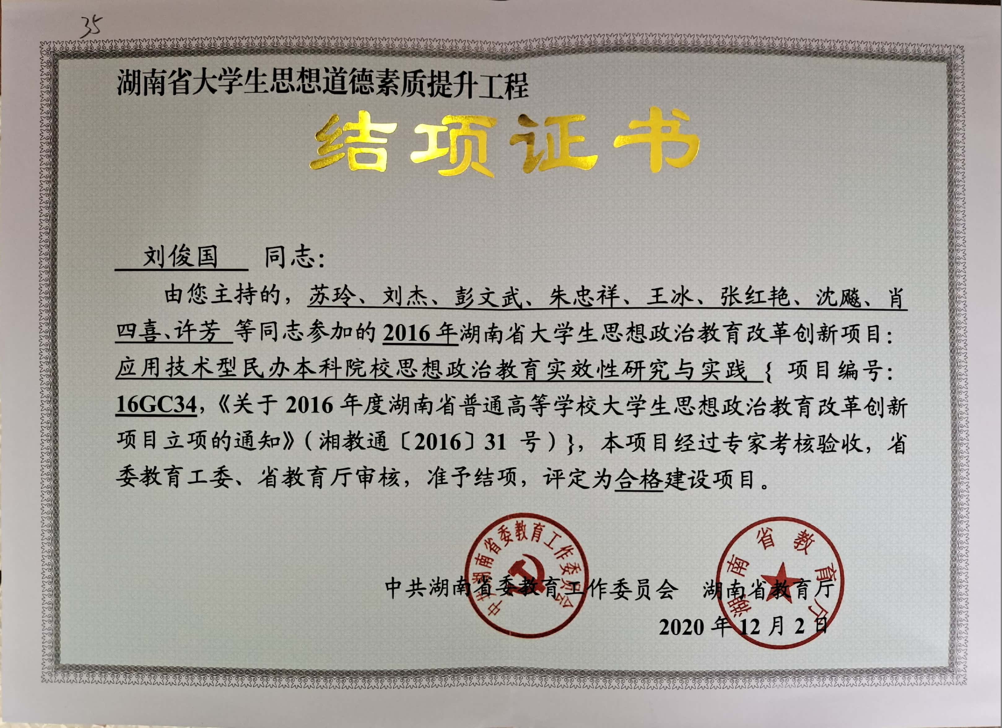 本网讯(通讯员 赵红深)日前,湖南省教育厅发布通知,公布2020年湖南省大学生思想道德素质提升工程大学生思想政治教育改革创新项目等四类项目结项结果,我校刘俊国主持的2016年立项大学生思想政治教育改革创新项目《应用技术型民办本科院校思想政治教育实效性研究与实践》和赵荣华主持的2016年立项湖南省高校辅导员名师工作室项目《大学生日常事务管理》经专家考核验收,省委教育工委、省教育厅审核,准予结题。