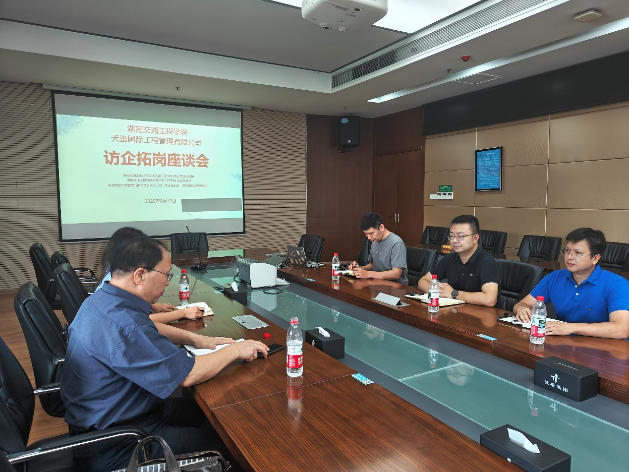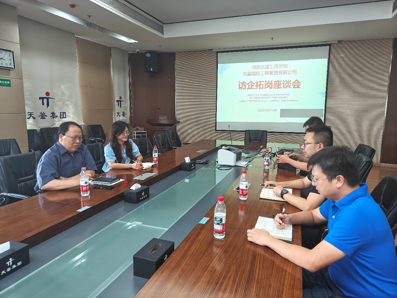 2025年8月19日,18新利在线登陆 交通运输工程学院院长罗迎社教授(博士生导师)、讲师聂思蕊一行到访天鉴国际工程管理有限公司,双方围绕校企合作、人才培养、学生就业等议题展开深入交流,旨在深化产教融合,协同育人,拓宽毕业生就业渠道,实现校企同发展。