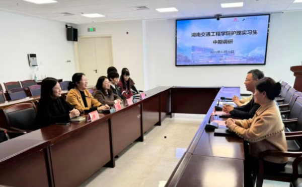 26日下午,学院调研团队首先来到岳阳市中心医院。在该院护理部蔡利霞主任的陪同下,老师们深入各实习科室,与正在轮岗实践的同学们亲切交谈,仔细询问了他们的工作内容、学习进度、生活状况及遇到的实际困难。邓丽书记鼓励同学们要珍惜宝贵的实习机会,将课堂所学理论知识与临床实践紧密结合,勤学多思,勇于实践,不断提升专业技能和职业素养,为未来的职业发展打下坚实基础。廖小立副院长则重点关注了实习生的安全保障和成长需求,表示学院将全力支持医院的带教工作,共同为学生营造良好的实习环境。