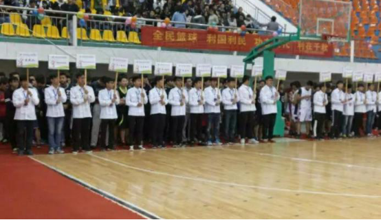 随着运动员进行曲的响起,旗手踏着整齐的步伐,进入篮球场,球员列队也整齐的排列在篮球场。