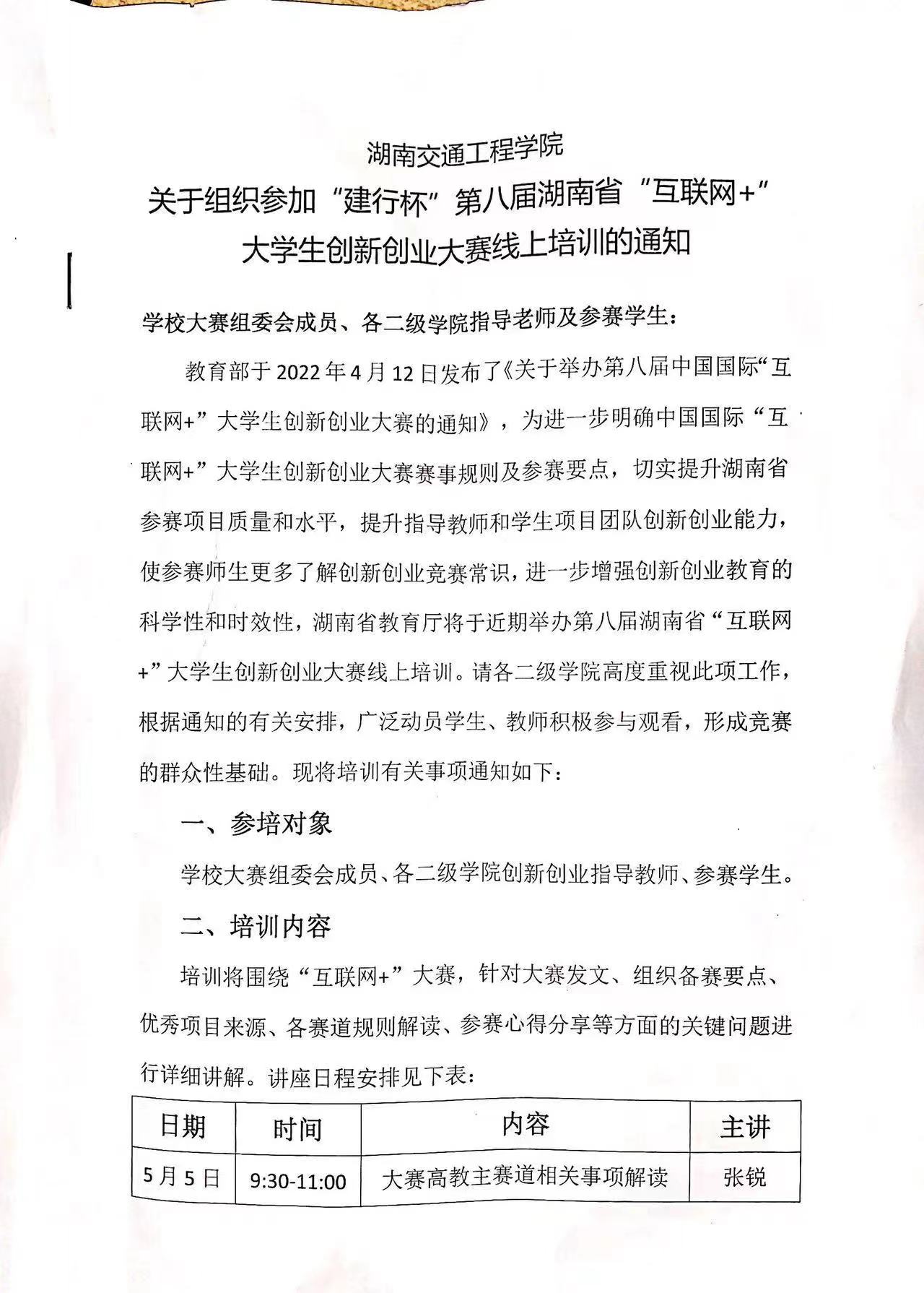 18新利在线登陆 关于组织参加“建行杯”第八届湖南省“互联网+”大学生创新创业大赛线上培训的通知