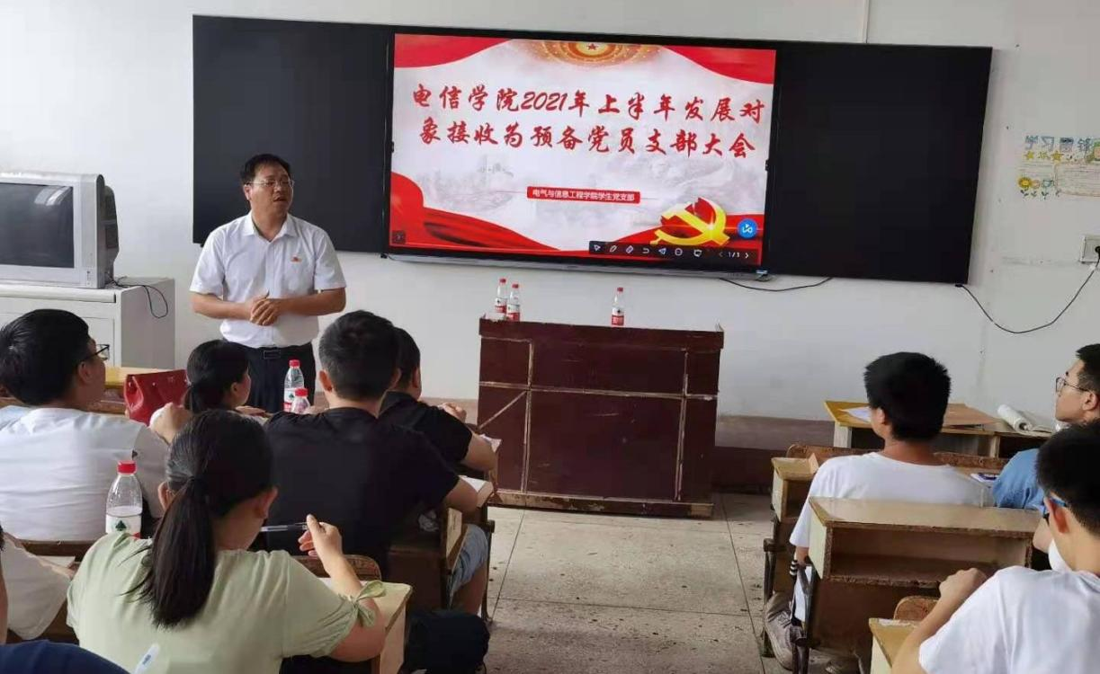 6月17日上午九点,电气与信息工程学院于教学楼702教室召开2021年上半年发展对象接收为预备党员支部大会。电信学院党总支书记刘忠明,党总支副书记兼团总支书记张敬会,学生党支部书记刘建军,学院60名正式党员,所有预备党员以及80名拟发展对象参加了本次会议,会议由学生支部书记刘建军主持。
