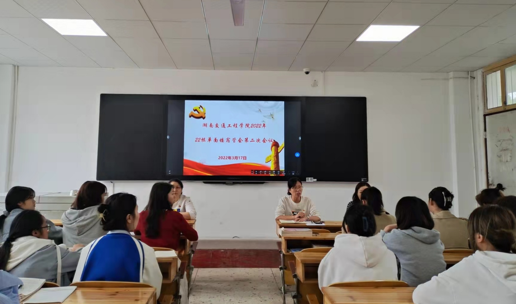 3月17日中午,18新利在线登陆 2022年22栋单面楼宿管会第二次会议,在教学楼209教室召开,参加此次会议的有护理学院党总支书记邓丽、党总支副书记兼团总支书记肖桂香、14栋学生社区党支部书记刘娣、22栋学生党员和预备党员以及学生自治管理委员会代表。