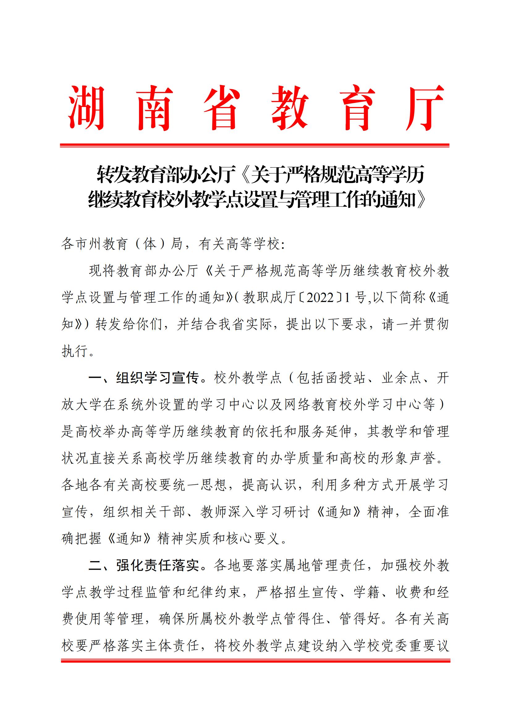 转发教育部办公厅《关于严格规范高等学历继续教育校外教学点设置与管理工作的通知》正文