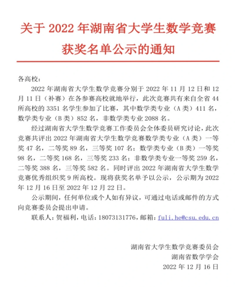 近日,2022年湖南省大学生数学竞赛获奖名单公布。11月12日、12月11日(补赛),比赛在各参赛高校就地举行。此次竞赛共有来自全省44所高校的3351名学生参加了比赛,其中数学类专业(A类)411名,数学类专业(B类)852名,非数学类专业2088名。