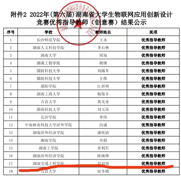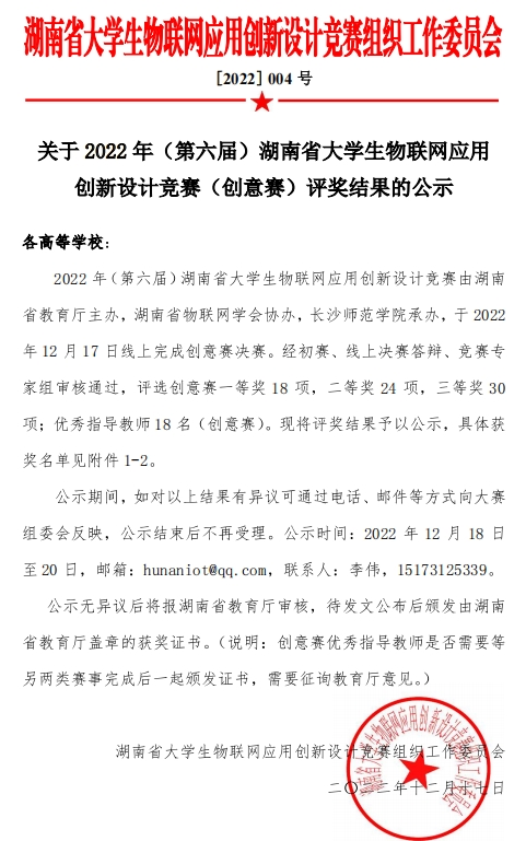 近日,2022年(第六届)湖南省大学生物联网应用创新设计竞赛获奖名单公布。该项赛事于2022年12月17日线上完成创意赛决赛。经初赛、线上决赛答辩、竞赛专家组审核通过,评选创意赛一等奖18项、二等奖24项、三等奖30项;同时评出2022年(第六届)湖南省大学生物联网应用创新设计竞赛优秀指导教师18名(创意赛)。