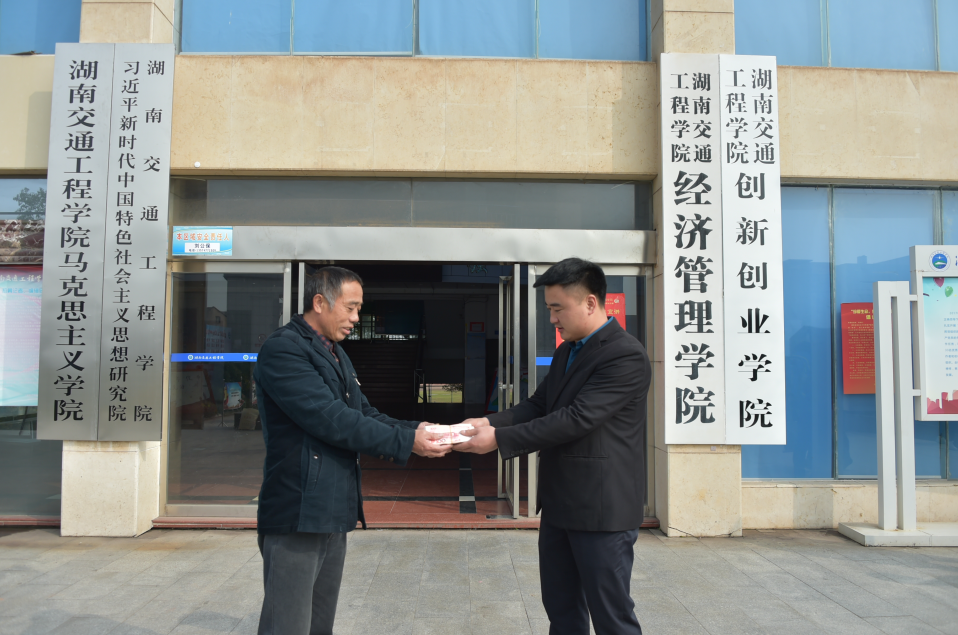 11月22日上午,经济管理学院物流专18级1班唐雪晴父亲来到学校,送上了一面写着“施援手情深似海,献爱心恩重如山”的锦旗和一封感谢信,以表达对广大教职员工学生经商户无私援助和爱心募捐的感激之情。经济管理学院书记宁恒代表学校接受了锦旗,我校党委副书记李先聪、经济管理学院院长朱忠祥、副书记罗朝勇、辅导员及相关教师代表参加授旗仪式。