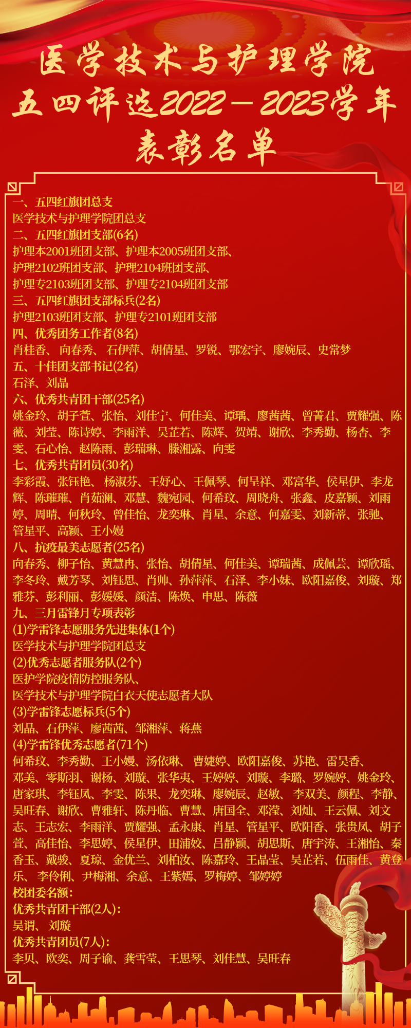 医学技术与护理学院团总支荣获“五四红旗团总支”和“学雷锋志愿者服务先进集体”称号;医护学院疫情防控服务队、医护学院白衣天使志愿者大队荣获“优秀志愿者服务大队”称号;我院党总支书记邓丽、贺九芳、彭华老师被评为首届“大学生良师益友”;副书记兼团总支书记肖桂香等7名团务干部荣获“优秀团务工作者”称号;护理本2001班团总支部等6个团支部荣获“五四红旗团支部”称号;护理2103班团支部、护理专2101班团支部荣获“五四红旗团支部标兵”称号;石泽、刘晶荣获“十佳团支部书记”称号;姚金玲等27名同学荣获“优秀团干部”称号;李彩霞等37名同学荣获“优秀共青团员”称号;向春秀等25名志愿者荣获“抗议最美志愿者”称号;刘晶等5名同学荣获“学雷锋志愿标兵”称号;何希玟等71名志愿者荣获“学雷锋优秀志愿者”称号。(具体名单附后)