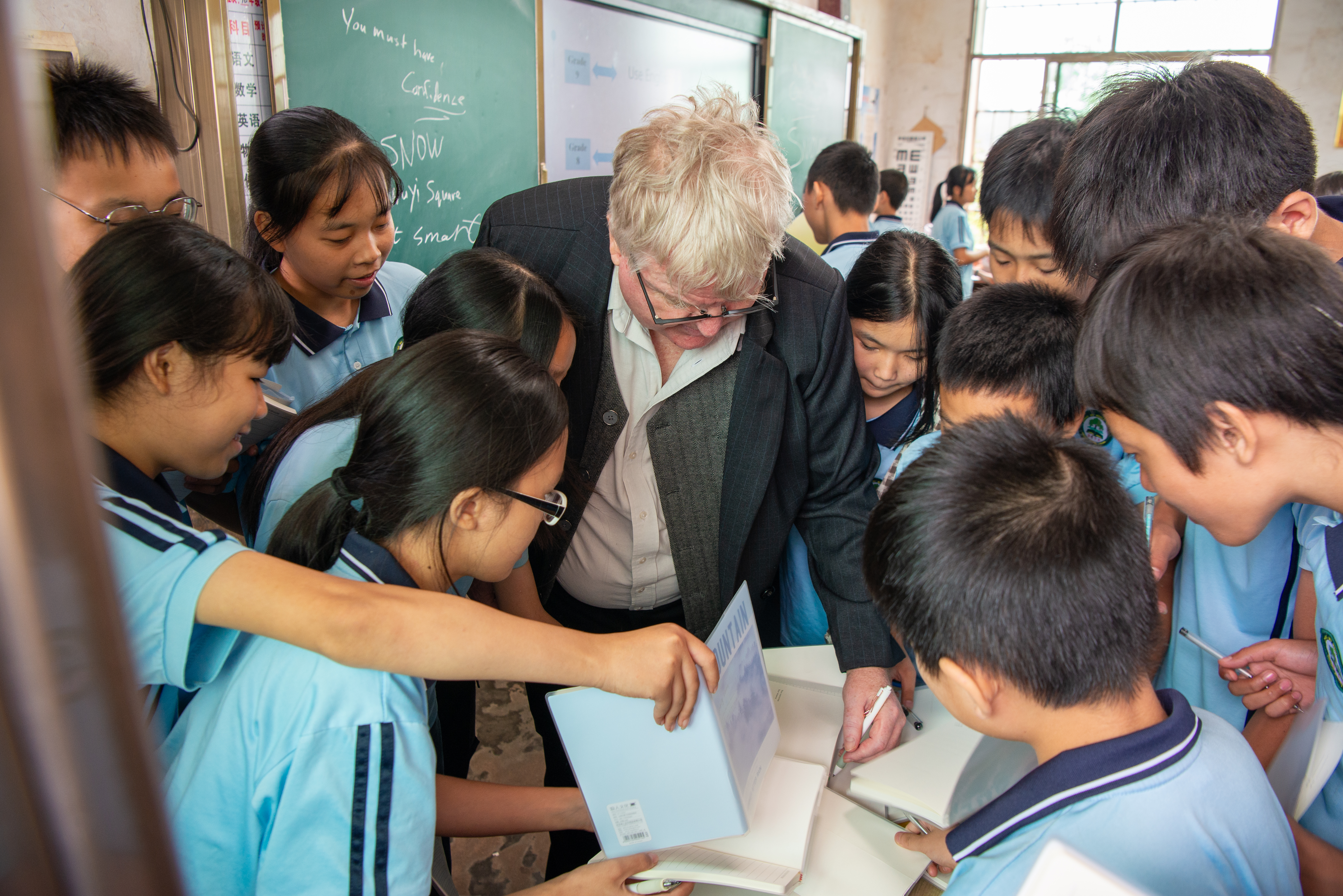 上午9时40分,学生课间操,外教William与全校同学见面并发表简短的励志演讲。演讲完毕,同学们争相与外教对话互动,并里三层外三层围着外教签名。