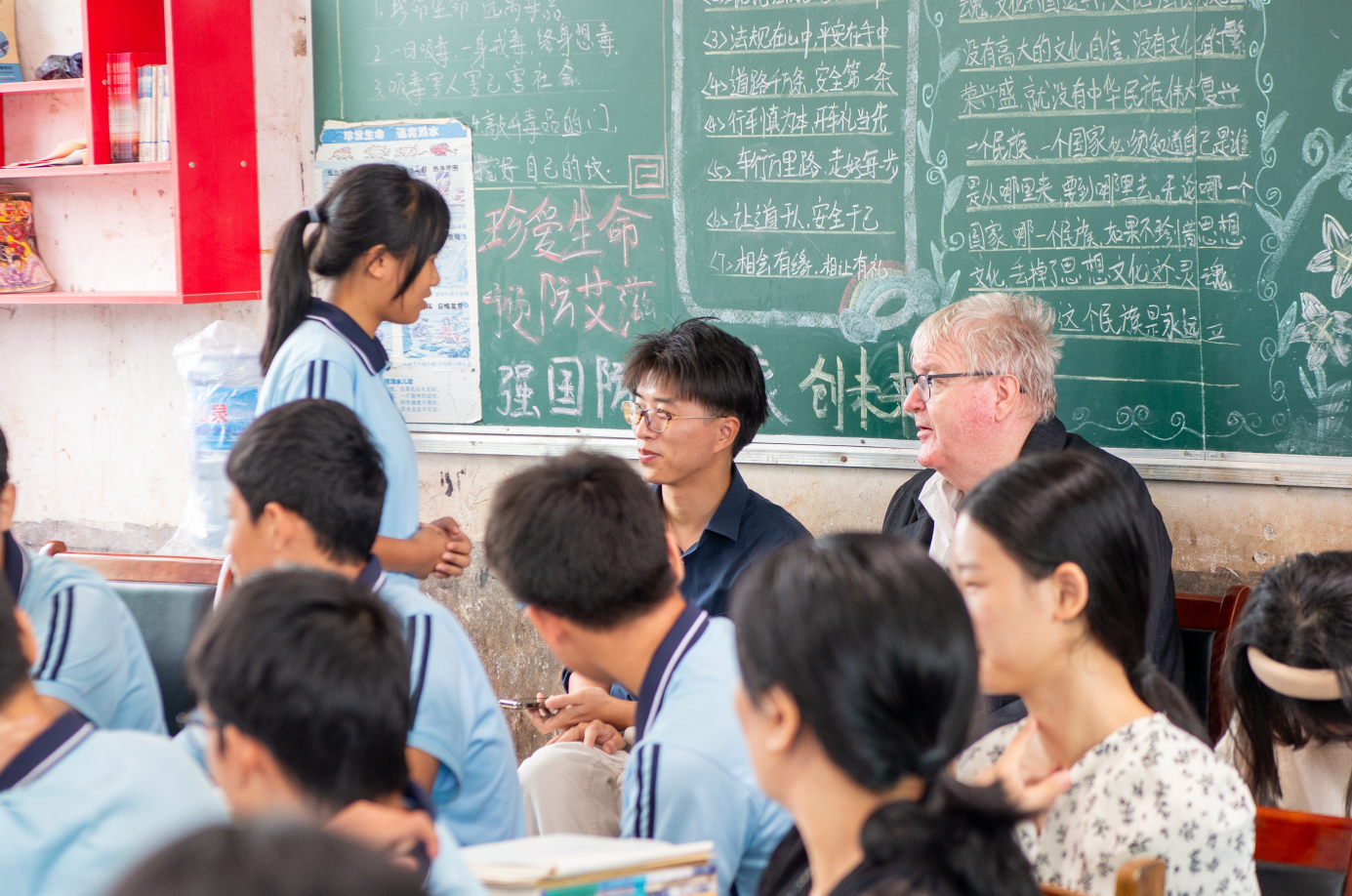 上午10时,外教William走进初三271班和同学们面对面交流,分享其在中国山东、广州、衡阳等地的工作和生活经历及融入当地百姓的场景,阐述了他对中华文明、湖湘文化和雁城历史的了解与赞誉;并与留守儿童亲切交流互动,勉励同学们努力学习,天天向上,走向世界,走向未来。然后,刘彪给全班同学赠送纪念品和月饼,并给学校捐赠图书100册,鼓励同学们好好学习。刘彪指出,作为帮扶单位,我校将帮助学校开展声乐、舞蹈、器乐、书画、体育等体艺教育活动,丰富留守儿童的课余文化生活,促进留守儿童身心健康成长。