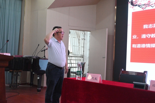 全体新入职教师集体宣誓,冯良贵领读《教师誓词》。
