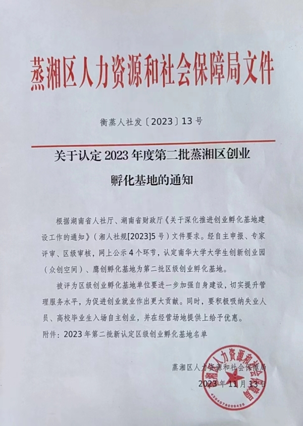 我院鹰创孵化基地获批2023年度第二批蒸湘区创业孵化基地