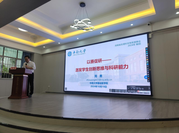 会议期间,两场精彩的学术报告成为亮点。湖南省生理学会秘书长、中南大学生理学系主任向阳教授做了关于生理学一流课程建设及实施的主题报告,此报告讲授了教学理念、课程建设,教学方法等方面,为推动生理学课程的高质量发展提供了宝贵的思路和方法。专家们深入探讨了如何优化课程设置、创新教学方法,以培养出更多具有扎实专业知识和创新能力的优秀人才。周勇教授以赛促研,激发大学生创新思维与科研能力的报告,则强调了通过竞赛活动激发大学生对学习的兴趣和热情,提高他们的创新思维和科研实践能力。