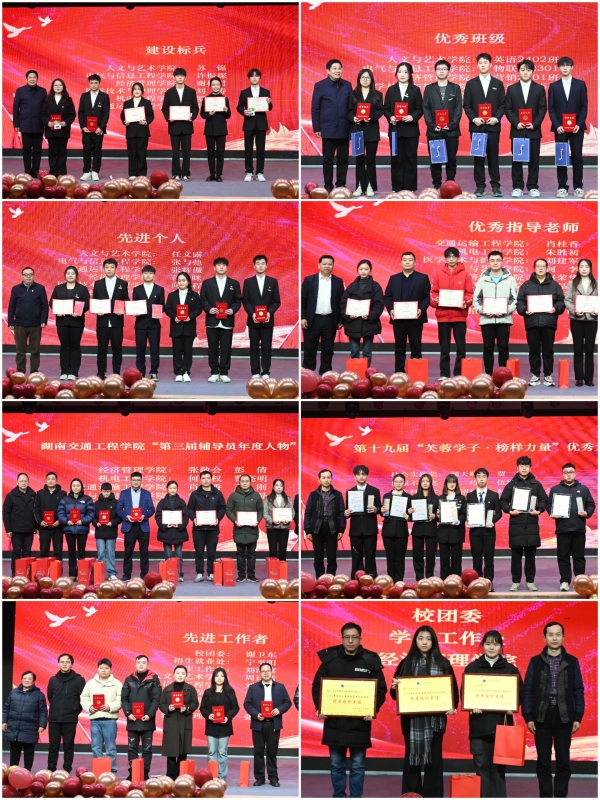 副校长余孟辉宣读4个表彰决定: 《第十九届“芙蓉学子·榜样力量”优秀大学生》《2024年大学生暑期返家乡社会实践活动》《“共创文明校园,共建优良学风”主题教育实践活动》《18新利在线登陆 第三届辅导员年度人物》。校领导分批次为获奖集体和个人颁奖。