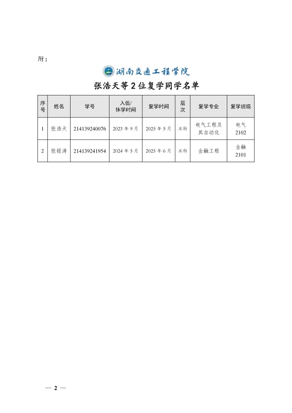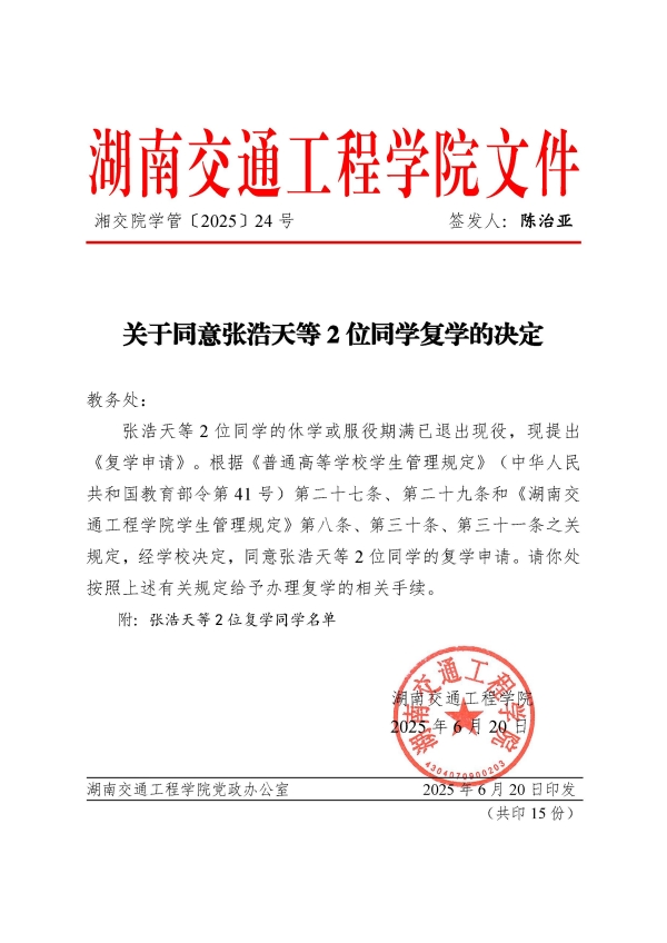 关于同意张浩天等2位同学复学的决定(湘交院学管〔2025〕24号)