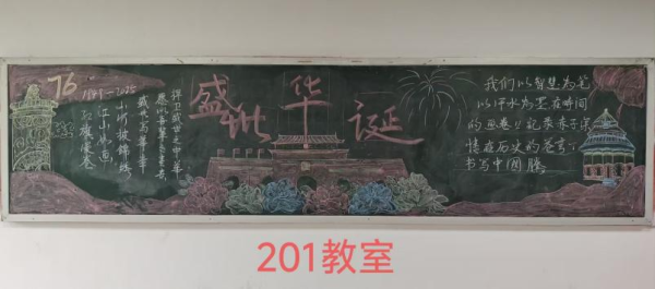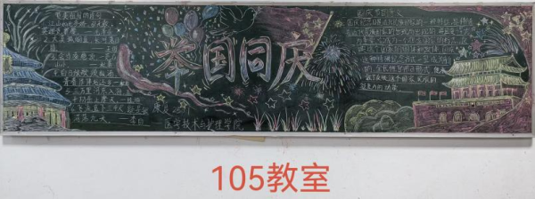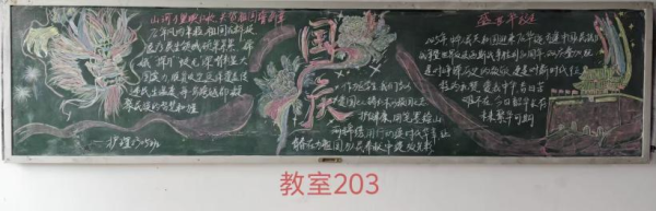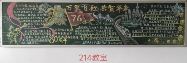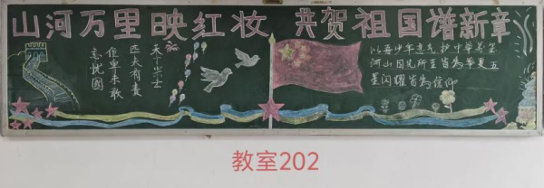 为热烈庆祝中华人民共和国成立七十六周年,我院于国庆节前举办了“山河万里映红妆,共贺祖国谱新章”主题黑板报创作活动。各班积极参与,精心设计,创作出了一批优秀作品。