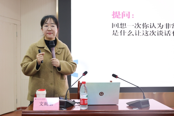 湖南省高校大学生心理健康教育研究与实践年度十佳心理咨询师、湖南大学心理健康教育中心二级心理咨询师文姹紫在《心理咨询技巧与方法》讲座中,结合自身的教学经验,给辅导员们介绍了多种咨询训练法,重点讲诉了在心理咨询中的观察能力,面对来访者要学会倾听、善于观察、发现问题、利用技巧,正确处理,从而提升咨询效果。