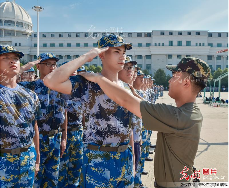 2021年9月5日,18新利在线登陆 新生在训练敬礼,教官在给新生纠正动作。