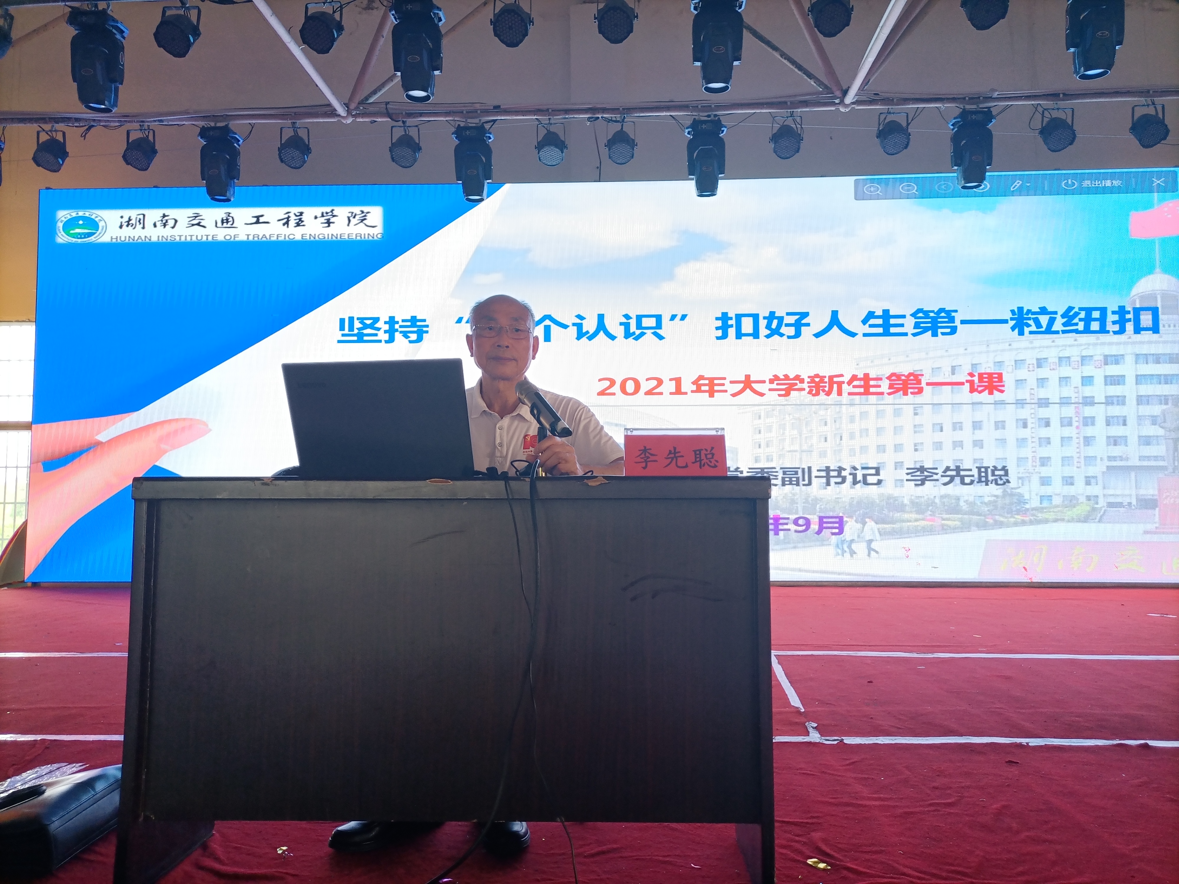 本网讯(记者 摄影 赵红深 )9月16日下午,2021级全体本科和专科新生在大学生活动中心聆听入校第一课,校党委副书记李先聪以“坚持 '四个认识' 扣好人生第一粒纽扣”为题作了“第一课”主讲。党务工作部、党委宣传部、学生工作部、校团委等相关部门和各二级学院书记参加了听课。