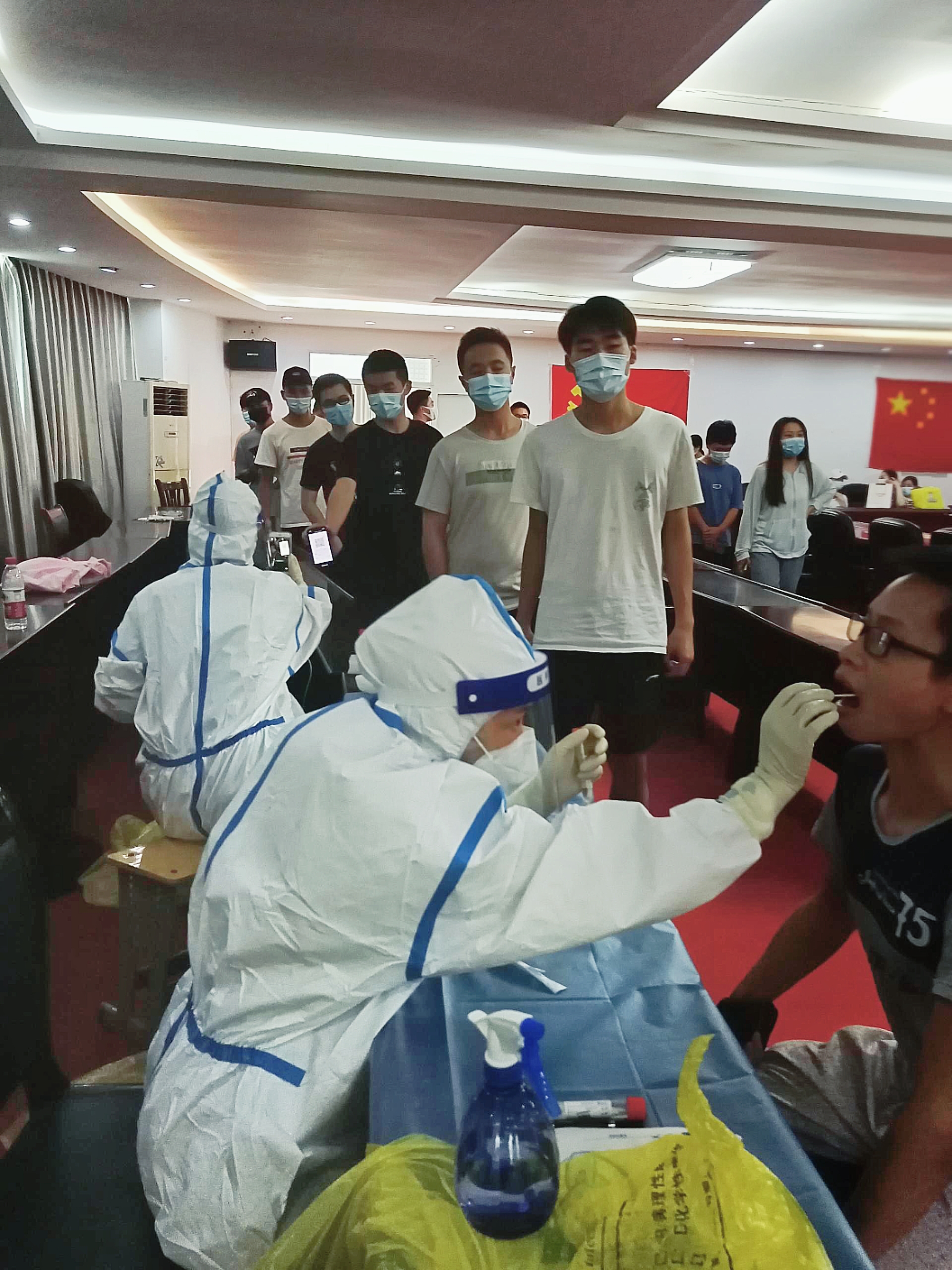 17日8:30开始,6个检测点分别检测 6个二级学院:教学楼一楼大厅3个组,检测电信学院2561名学生及该院全体教职工;图书馆一楼大厅2个组,检测经管学院1634名学生及该院全体教职工;护理楼二楼2个组,检测交通学院1814名学生及该院全体教职工;体育馆101室2个组,检测机电学院1483名及该院全体教职工;实训大楼靠近15栋大厅3个组,检测人文艺术学院2446名学生及该院教职工;体育馆103室1个组,检测护理学院1083名学生及该院教职工。体育馆101或103接受核酸检测校领导及行政处理干部职工。剩下两个组检测其他人员。