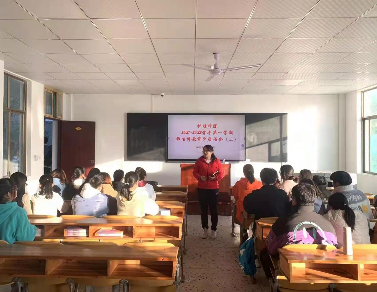 为稳步提高学院教学质量,融洽师生关系,使教学工作更上一个台阶,按照学院教学工作部署,11月25日下午16:30,护理学院在教学楼103、104、105教室分年级召开2021-2022学年度第一学期评教评学师生座谈会。学院行管干部、教师代表、各班学生代表参加座谈,会议由学院书记邓丽、副院长吴端生,副书记肖桂香分别在各教室主持。