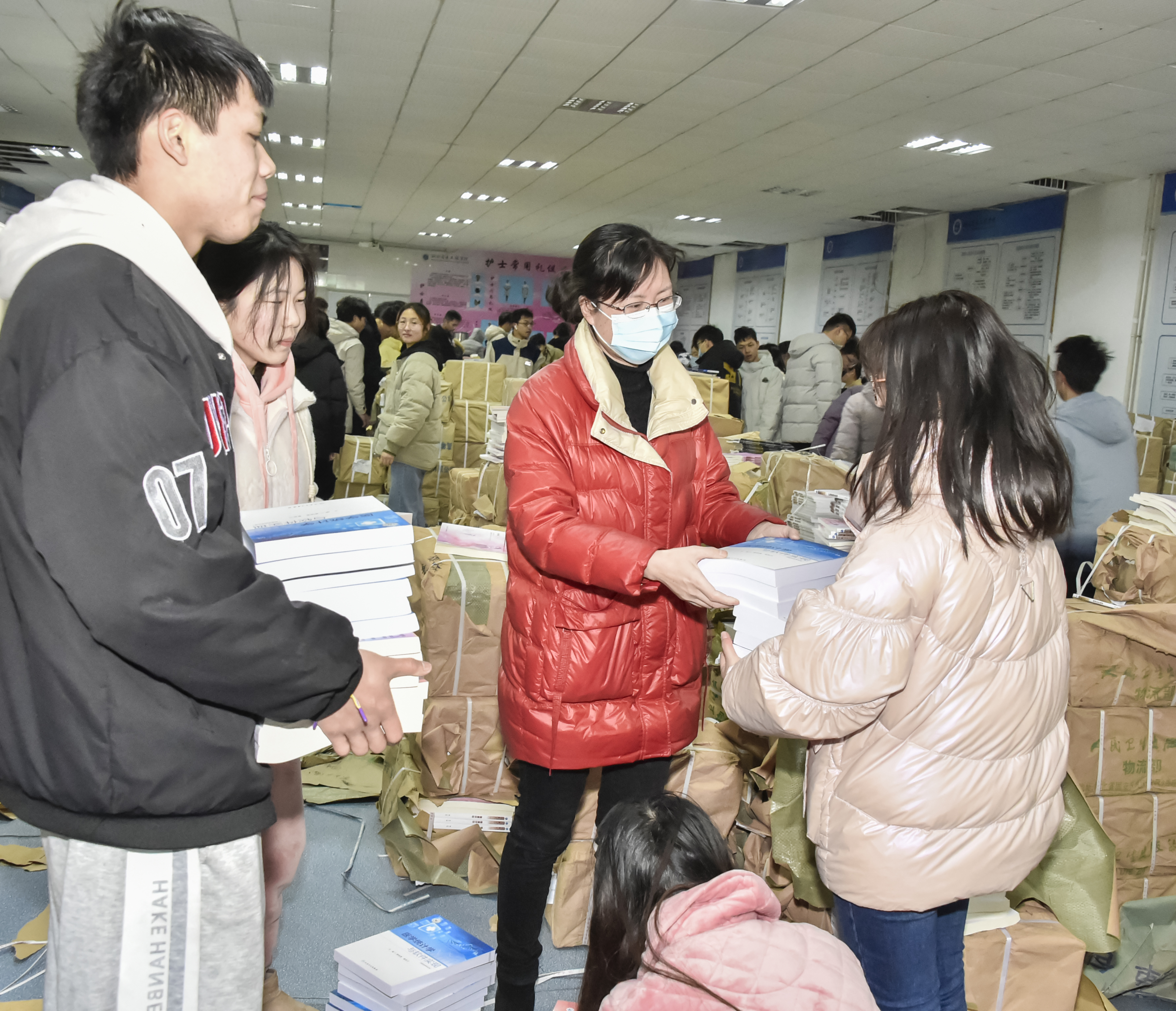 ▲ 护理学院书记邓丽带领学生干部发放教材