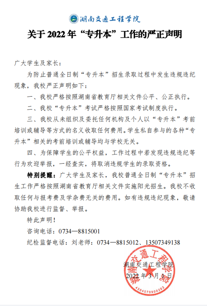 18新利在线登陆 关于2022年“专升本”工作的严正声明