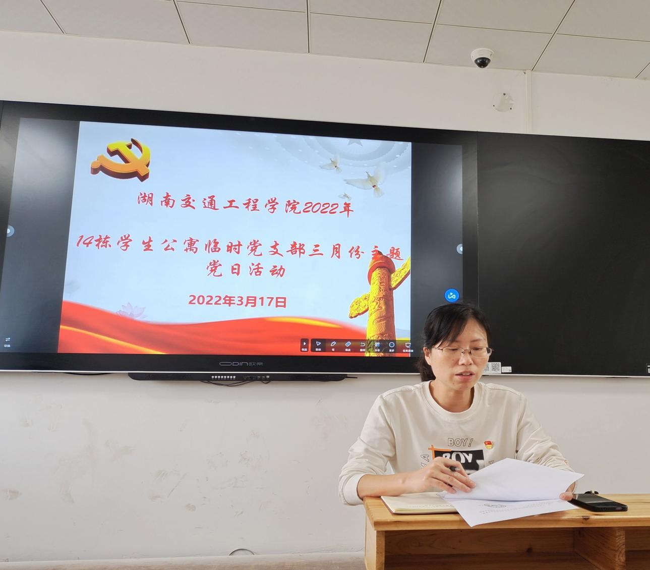 3月17日中午,14栋学生公寓临时党支部在教学楼209教室召开三月份主题党日活动。