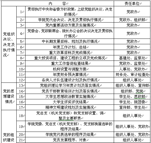 1.党组织决议决定及执行情况。主要包括:贯彻落实上级党组织决定、决议情况;学院党委确定的全局性工作、中心工作以及阶段性工作情况;党务工作年度计划、总结;党务工作重要活动实施方案、工作总结等情况。