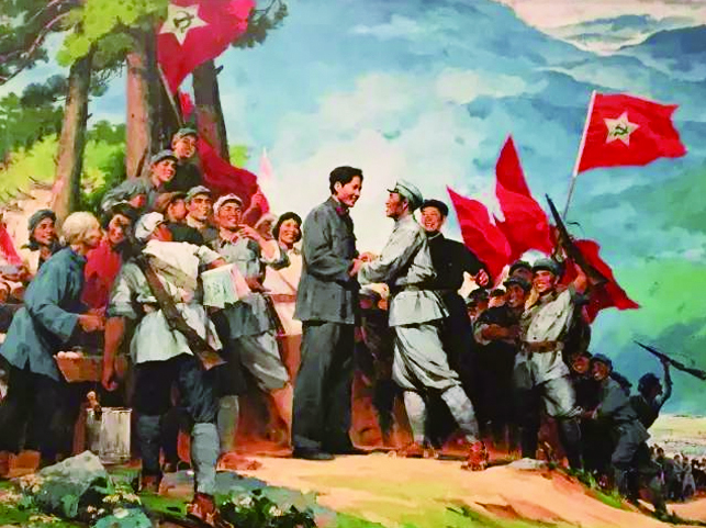 1928年4月,朱德、陈毅率领南昌起义保留下来的部队及湘南起义军在江西宁冈同毛泽东领导的部队会师。图为油画《井冈山会师》