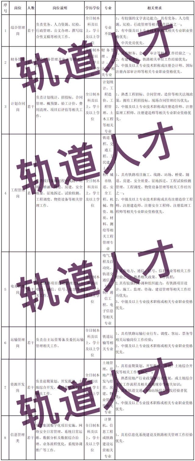 因集团发展需要,现诚聘工程类、综合类、财务类等专业人才,具体招聘岗位及要求详见附件:《广东省铁路建设投资集团有限公司社会招聘职位表》。