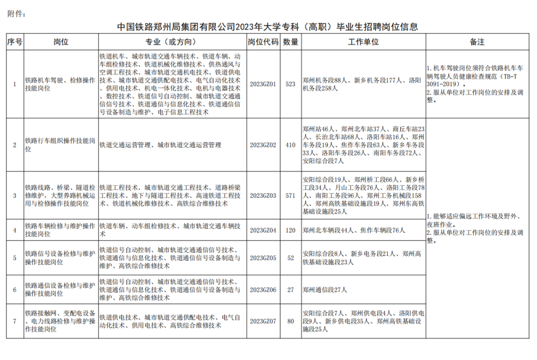 根据企业发展对人才的实际需求,中国铁路郑州局集团有限公司拟招聘全日制普通高等院校大专 (高职)学历毕业生,现将有关事项公告如下: