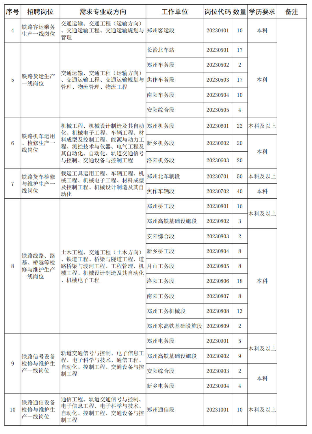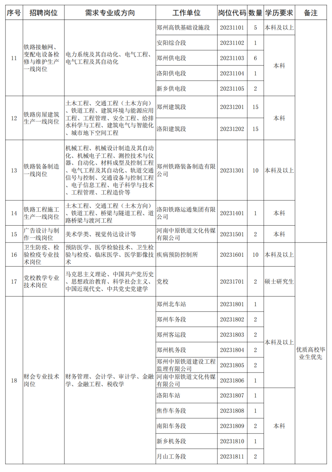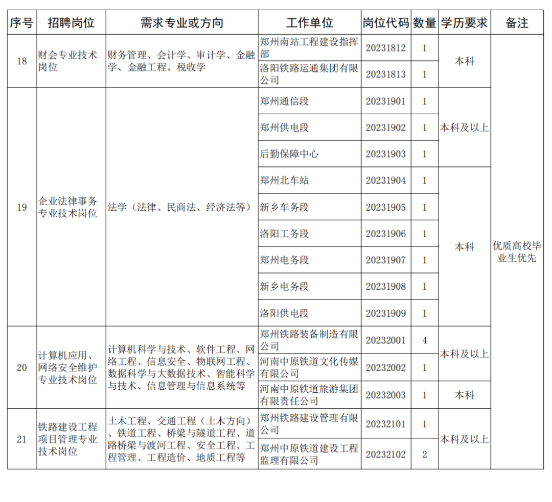 4.专业对口,成绩优良,符合招聘岗位要求的学历、专业等条件;其中序号为1-14号的岗位所学专业 是铁路专业方向或所学课程包含铁路专业课程的优先。