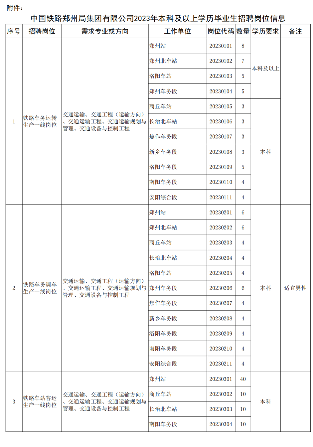 1、中国铁路郑州局集团有限公司2023年招聘普通高校毕业生公告(一)