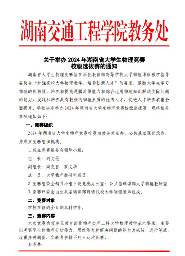 关于举办2024年湖南省大学生物理竞赛校级选拔赛的通知