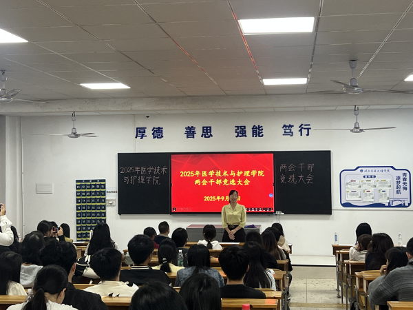 9月23日,医学技术与护理学院2025年两会干部竞选大会在教学楼201教室顺利举行。学院党总支书记邓丽、党总支副书记兼团总支书记刘建军、副院长廖小立、教务干事老师张怡春出席大会,全体辅导员及各班班长、团支书参加会议。