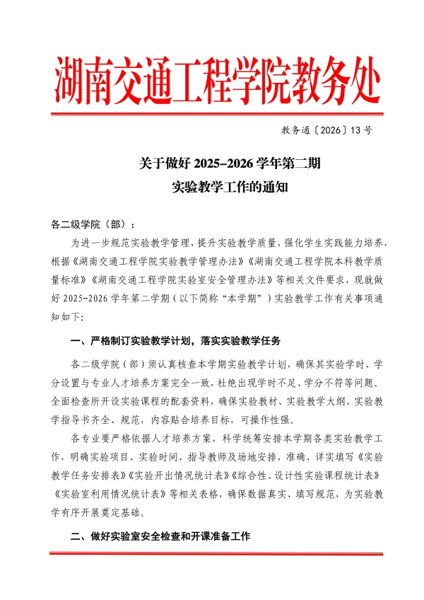 关于做好2025~2026学年第二学期实验教学工作的通知