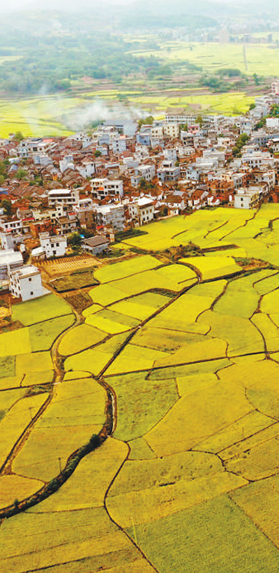 湖南省郴州市嘉禾县普满乡板贝村,金色稻田美丽如画。
