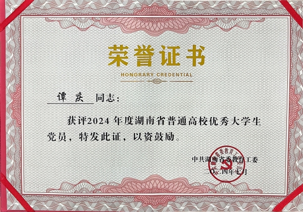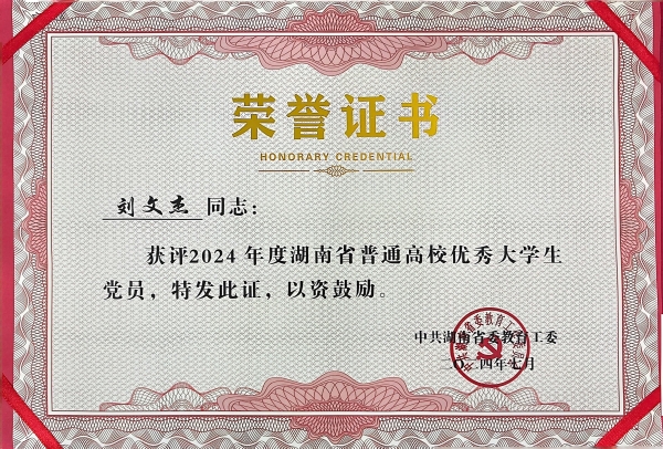 我校刘文杰等2名同学获评2024年湖南省普通高校优秀大学生党员