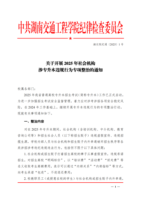湘交院纪通〔2025〕1号(关于开展2025年社会机构涉专升本违规行为专项整治的通知)
