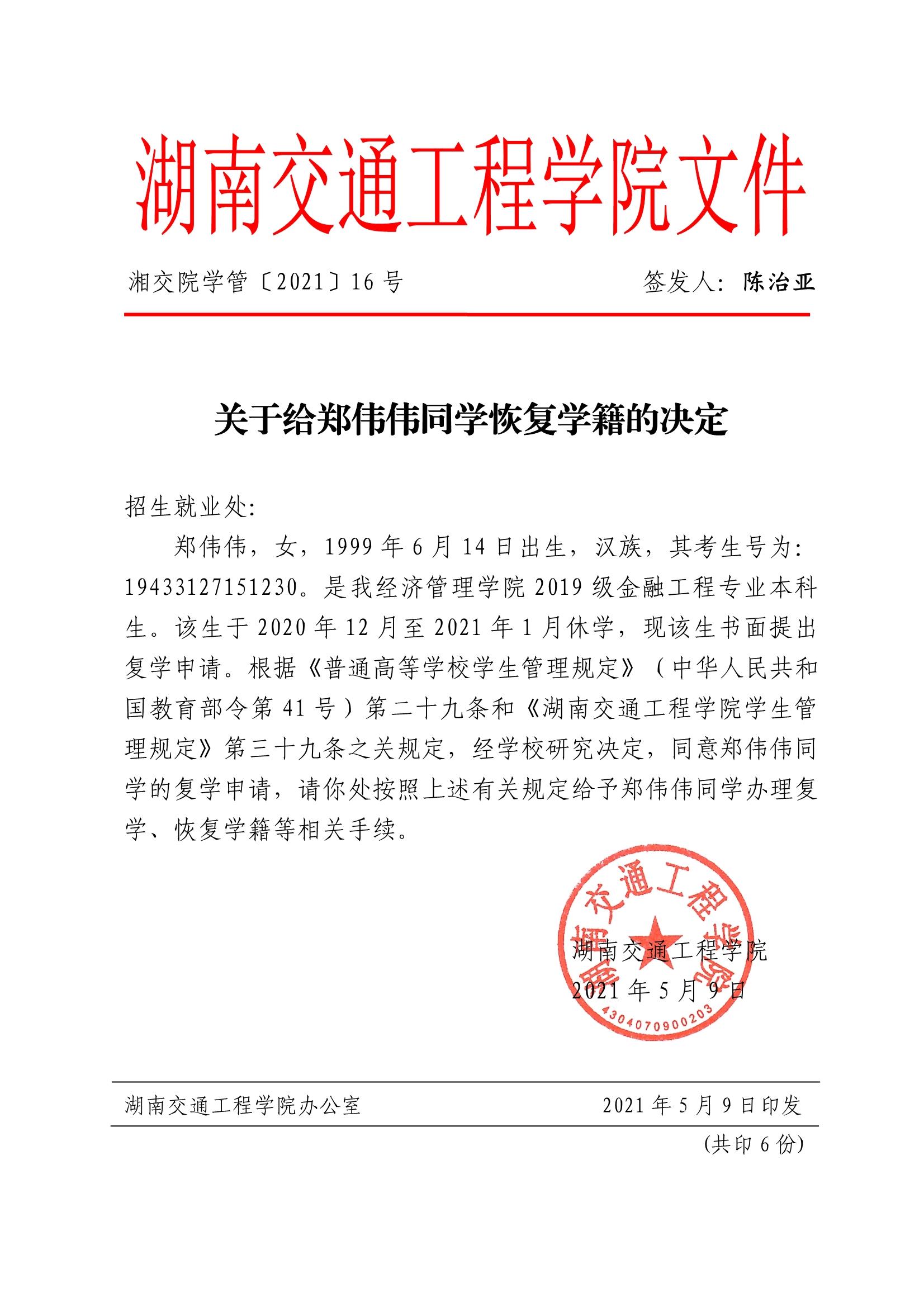 关于给郑伟伟同学恢复学籍的决定(湘交院学管〔2021〕16号)