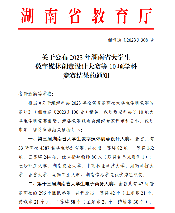 (转发)关于公布2023年湖南省大学生数字媒体创意设计大赛等10项学科竞赛结果的通知
