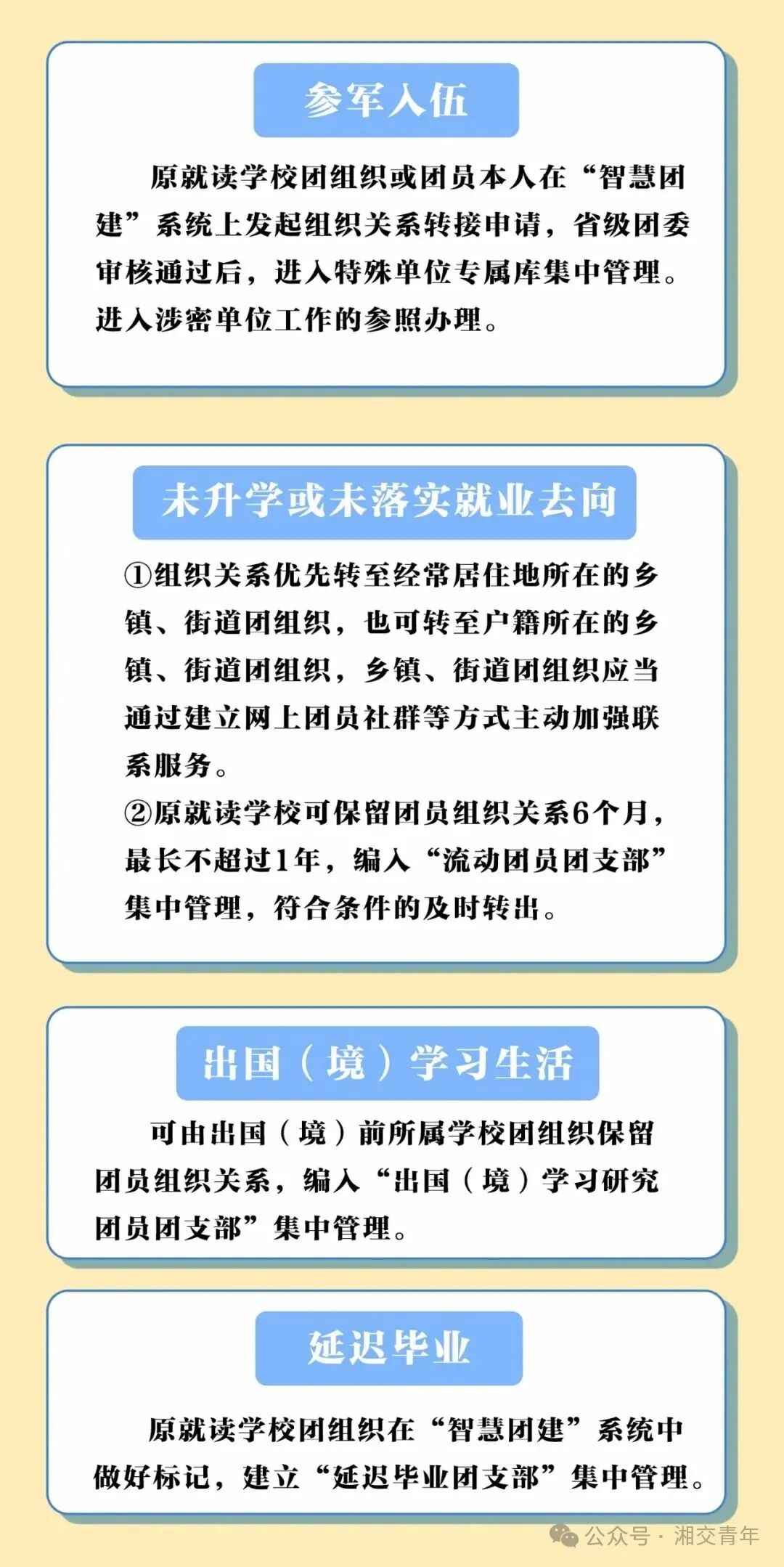 答:对组织关系转至居住地、户籍地所在乡镇、街道的毕业学生团员,乡镇、街道团组织应当主动加强联系服务,持续关注其就业动向,及时跟进做好组织关系转接。